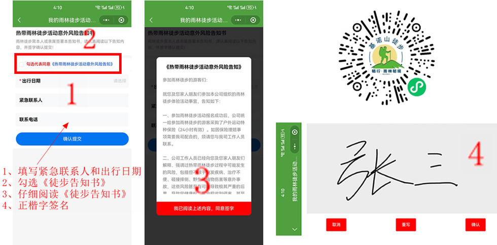 通过「基诺山雨林徒步报名预约」官网微信小程序商城,或致电客服专线(15368055258)获取在线预约通道。