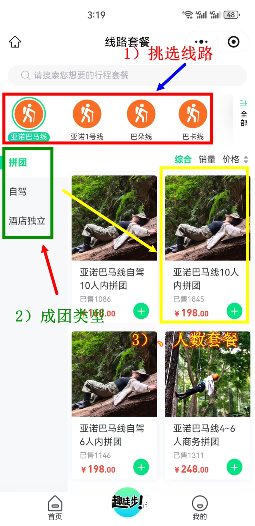 根据需要选择团型:拼车拼团、酒店接送独立成团或 自驾独立成团